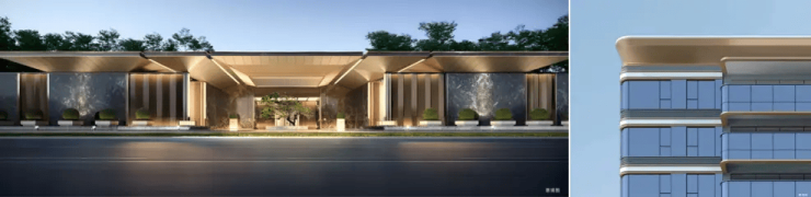 汲取“东方风铃”灵感,采用全柔光玻璃幕墙,创新弧面弯折式立面,以蓝灰色low-e玻璃幕墙配以香槟色铝板线条、米白色陶板,打造“竹编”神韵的审美立面。