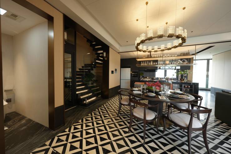 美学表达:室内空间搭配艺术品级软装,营造高雅格调。黑白拼花石材的餐厅地面,搭配带高脚椅的酒吧台,尽享餐前餐后的惬意时光,大胆运用色彩与高端材质,演绎出现代美学的极致魅力。