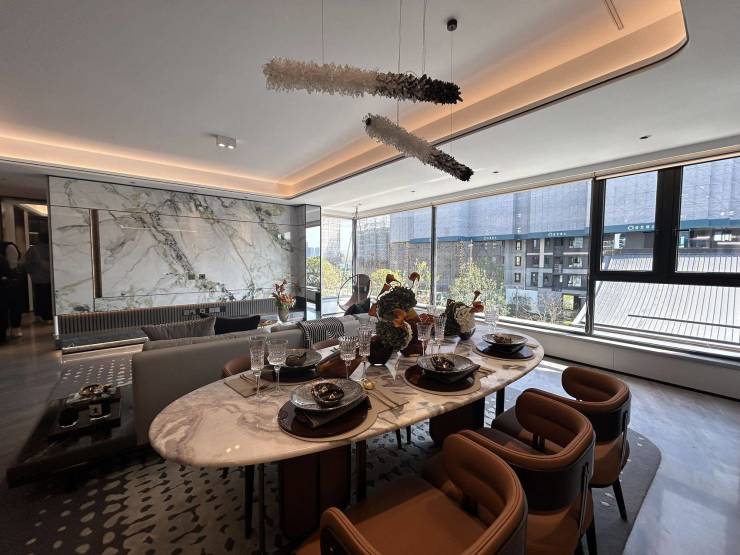 126㎡的户型为2梯2户,独立入户,拥有双面采光的电梯前厅;15米面宽+4.5开间朝南,拥有极好的日照、采光和观景效果;得房率约92%。