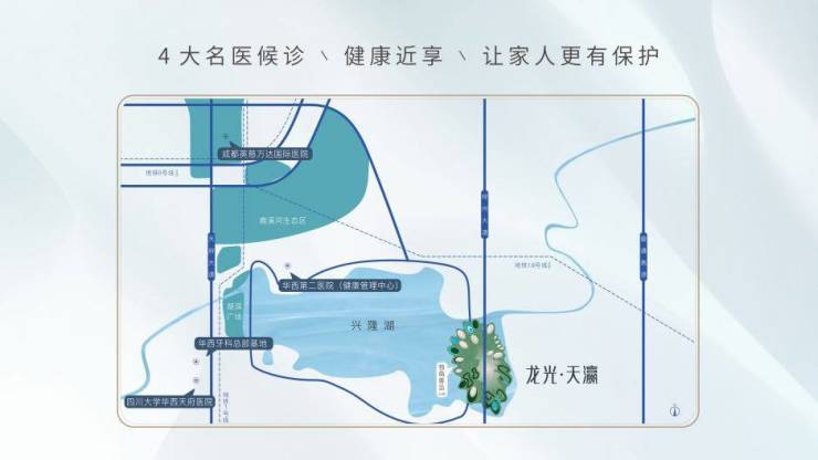 医疗资源包括华西医院天府院区和成都英慈万达国际医院。其中,华西医院天府院区是一家三级甲等医院,拥有1200张床位,医疗设备楼屋顶设有停机坪直接连通急诊,预计2021年整体建成投入使用。而成都英慈万达国际医院提供全美式医疗体系服务,并拥有20%的外籍医生。