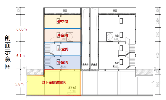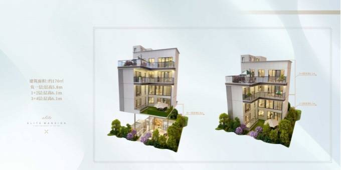 拥有前庭后院、星空屋顶,地面两层,单层约6.1米,地面总共12.2米,地下一层约5.8米,共18米(可变六层)