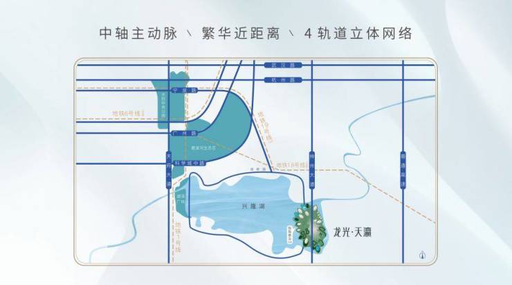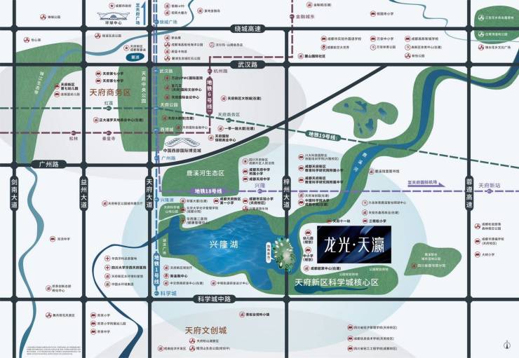 自然资源中的两大生态绿肺环绕:鹿溪河生态公园规划占地4500亩,位于鹿溪生态区内,是天府新区的生态亮点,如同一条翠绿的生态走廊,是目前成都规划中最大的湿地公园。兴隆湖总规划面积约为5100亩,是天府新区重要的中心区域之一,其珍贵资源价值远高于总规划面积2150亩的锦城湖,是成都最大的城市湖泊。
