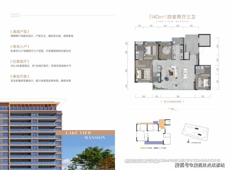独立电梯厅入户、私享入户花园、7米阔尺宽厅,生活阳台+8.7米阔景阳台,四面宽,南北通透,双套房设计至臻选择