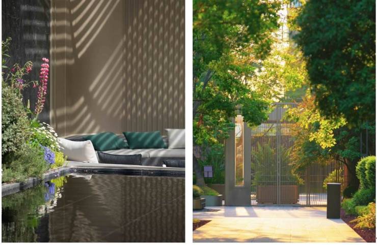 景观营造: 一线江安河湾景观资源,私家花园与屋顶露台,打造多重立体景观,将自然融入生活。露台配备了休闲沙发、酒吧台以及装饰性绿植,营造出一个集休闲、娱乐和社交于一体的户外空间,如同宝格丽酒店般,将自然与建筑完美融合,营造低调奢华的氛围。