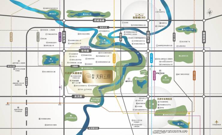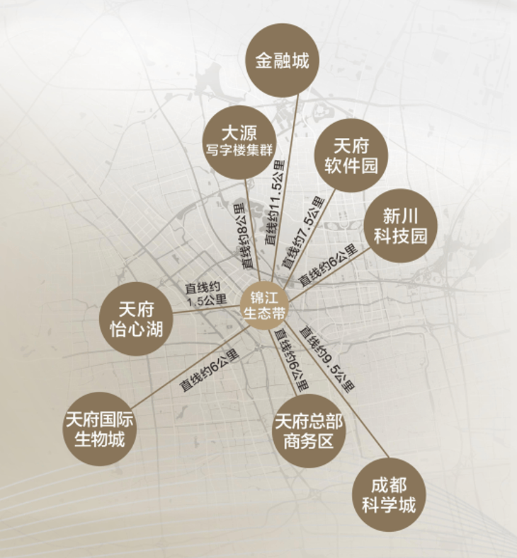 剑南大道黄金动脉,锦江生态带2.0:项目地处锦江生态带,是天府总部商务区内的高端住宅社区,位于剑南大道与益州大道黄金路段。该区域连接金融城、大源与兴隆湖、科学城,是城市发展的关键节点。丰富且集中的配套设施(商业、学校、医院、公共绿地等)均在2公里范围内,尽享城市便利。