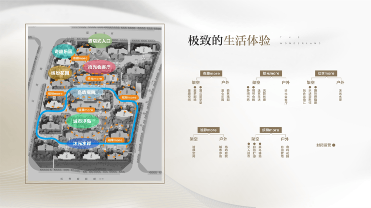 “七景”:酒店式入口、拾光会客厅、岛屿庭院、城市浮岛、沐光水岸、缤纷花园、奇趣乐园,涵盖多功能节点。