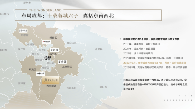 深耕成都:十载之间布局蓉城六子,覆盖东南西北全面发展。2013年城南《邦泰·华府公馆》、2021年城东《邦泰·宽语》、2022年城北《锦绣和鸣》及中心城区《邦泰·云璟》、2023年天府新区《邦泰·天府云璟》及城西《邦泰·熙华天骄》。邦泰天府云璟作为邦泰在成都天府新区的首个项目,位于锦江生态带,这一核心稀缺地段与天府新区国家级战略新区的战略完美契合。
