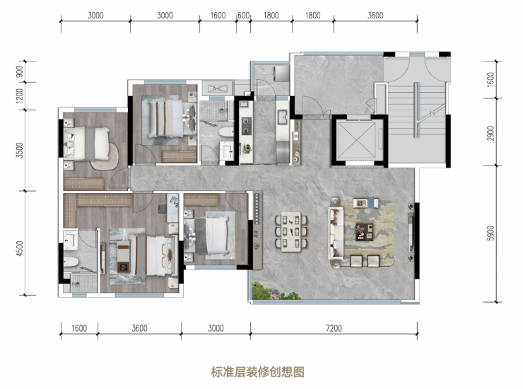 → 户型亮点:四房双套房设计、独立入户电梯私厅、1梯1户,板式南北通透、约7.2m*6.5m大开间、约270°客厅观景面