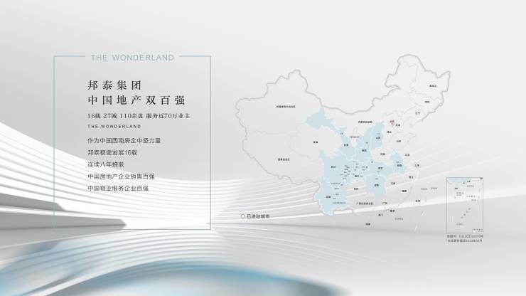 邦泰集团 四川房企综合实力TOP1:中国西南房企中坚力量,16载深耕27城,110余个项目,管理面积超2000万㎡。连续八年荣登中国房地产企业销售百强榜、中国物业服务企业百强榜。