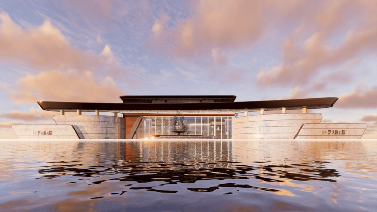 酒店精奢风大宅,80米大尺度展示面:结合迎宾水景,豪华的酒店式回家入口,搭配超白玻与香槟金不锈钢装饰,入口两边的景墙以雅柏白灰石材搭配,彰显出极致的尊贵感