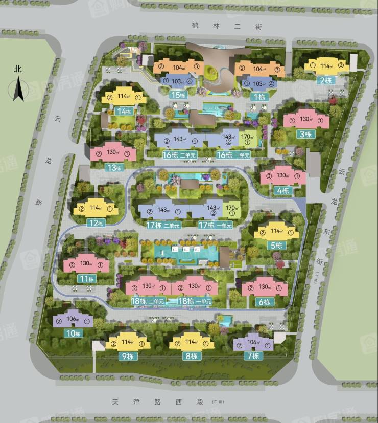 阵列式板楼布局,全楼栋南北朝向:邦泰16载匠心巨作,项目规划18栋小高层/洋房,2栋高层,均为南北朝向阵列式点状布局,高层/小高层首层全架空,确保园林空间的同时保证户型通透性与采光。