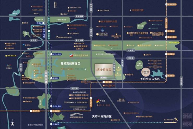 人文聚落:麓湖4A艺展中心、雪莲堂美术馆、省博物馆(规划中)、天府大剧院(规划中);