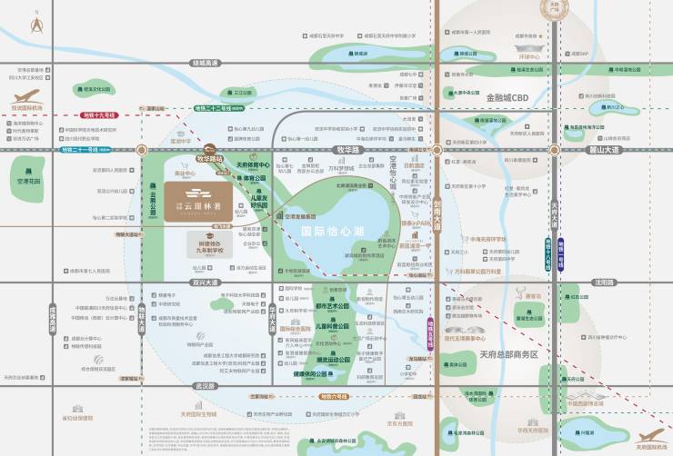 项目雄踞天府大道与剑南大道双轴芯,坐享"金融城-怡心湖-天府CBD"黄金三角区位。作为成都南拓战略核心区,8.4平方公里的怡心湖新城由国际顶尖机构阿特金斯操刀规划,参照新加坡滨海湾设计理念,将打造产城融合的现代化新城。项目所在的A区定位为高端低密住区,未来价值可期。
