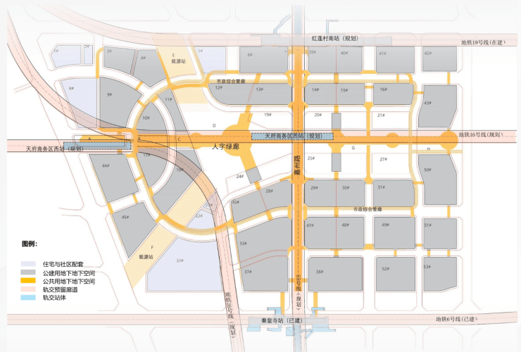 地下加密:在轨交站点、区域地标及商业中心间的主体步行空间设置了活力商业广场,布局文化、休闲、展示等公共服务功能;同时依托轨道客流构架慢行主线,以及地下独立车行系统及各物业单元的地下大堂、地下停车场系统互通互联,并通过简洁导引系统进一步完善交通。