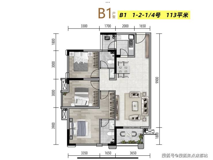 B1户型 建筑面积约113㎡三室两厅两卫