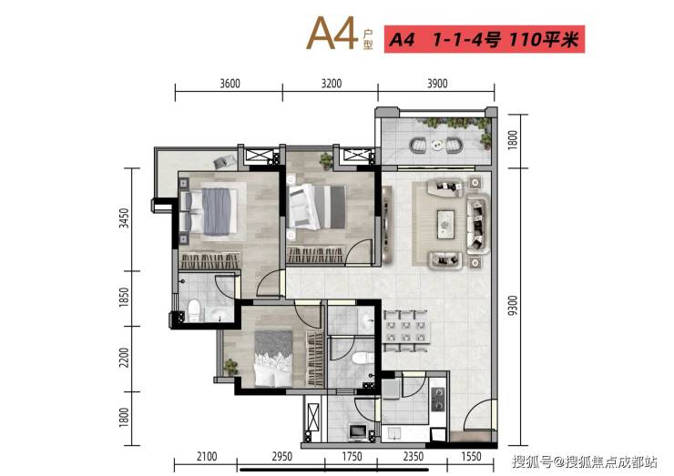 A2/A4户型 建筑面积约110㎡三室两厅两卫
