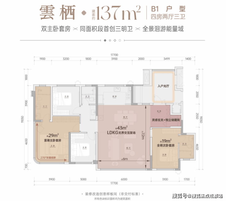 户型设计:均为套四户型,有双卫和三卫的不同配置,满足不同家庭结构需求,空间布局合理,动静分区明确。