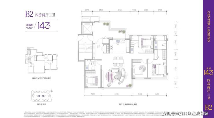 建面约143㎡户型:实得率最高达110%,分为B1(主卧带阳台)、B2(方厅布局)、B3(端厅+270°采光)三种版本,满足不同家庭结构需求。