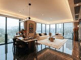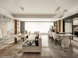 精装大师颜政以“草木萌动”为主题,采用琉璃绿与英伦棕双主色调,前者象征自然活力,后者传递大地沉淀的贵气,与园林的蔚蓝基调相得益彰。拱券、廊柱、曲面等法式经典建筑元素被融入空间设计,与室外廊柱与叠水景观的几何呼应,强化了“东方巴黎”的奢雅意境。
