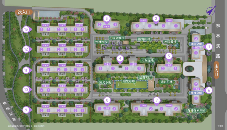 以一环两轴·双中庭·三花园·多架空场景为设计理念,书写尊崇归家场景。半围合式的布局造就最大约130米奢阔楼间距,南北两大中庭空间,东西向尺度开阔,视野无遮挡。