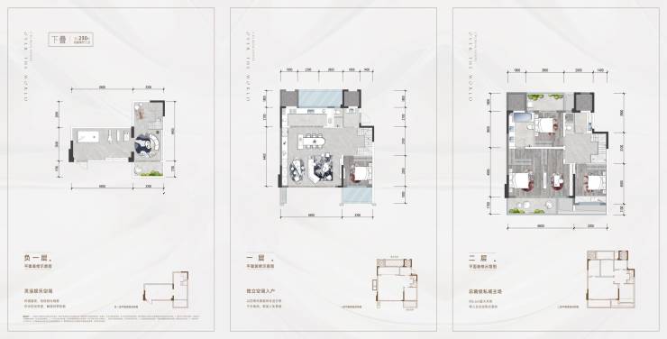 主力户型:下叠230㎡(实得350㎡)、中叠209㎡(实得260㎡)、上叠230㎡(实得360㎡)