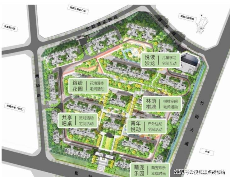 一轴一环六园,中轴对称,充满仪式感生活主景观轴;长约700米环形健身跑道串联中庭景观;楼栋间打造六大主题花园,全新社交娱乐空间。