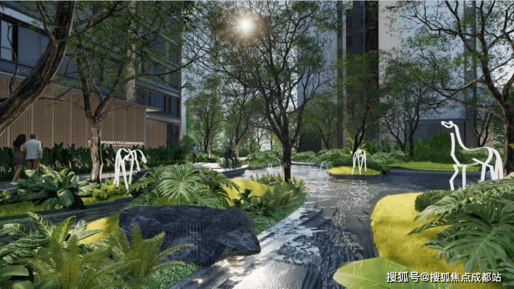 主入口对景水院,采用“自然系”主题雕塑与浑然天成的景致湖滩,同时以天然石块、片岩结合下沉卡座,打造约300㎡曲水流觞逸境。