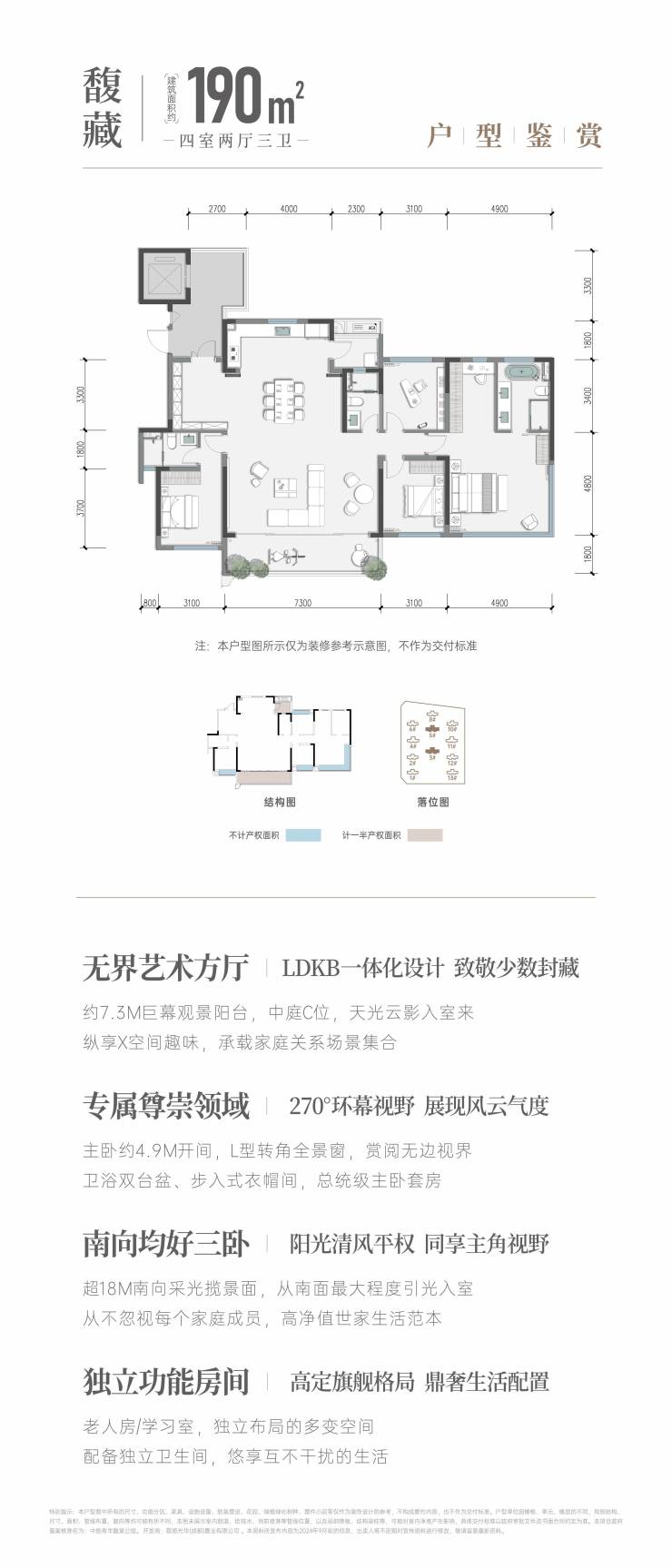 顶配规格:约63㎡客厅+7.3米景观阳台,主卧“全景舱”设计,私享独立电梯厅;