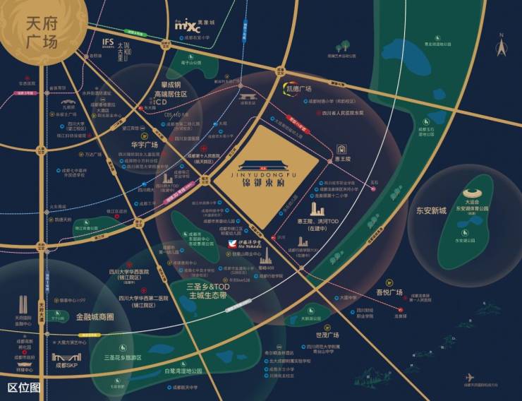 项目地处“春熙路——东大街延线——驿都大道”黄金主轴与三环环城中轴的交汇处,毗邻主城与锦江三圣乡生态带,一路向东链接起东安新城版块,形成第一条完整的“成都东轴发展都市生长带”,独享“既东进、又主城”的都市核心位置。