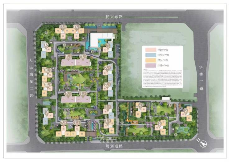最阔楼间距: 区域内最低建筑密度,楼间距44-138米
