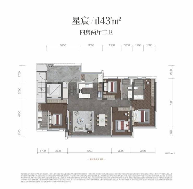 该户型采用LDKB(客餐厨阳台)一体化设计,打造出极具开放感的家庭社交核心区域。双套房的设计十分贴心,既充分保障了主人的私密空间与尊崇地位,又为其他家庭成员提供了独立且舒适的居住空间,无疑是成长型家庭一步到位的理想之选。 建面约179㎡