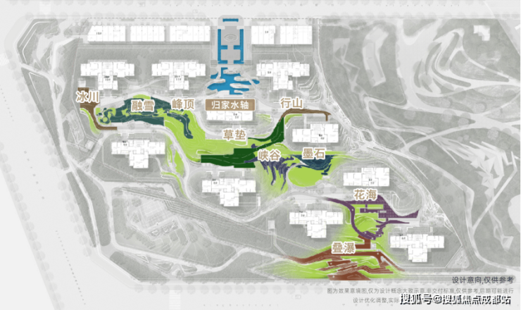 园区景观中轴,指向人字绿廊与西岭雪山,整体以“川西秘境”为出发点,对标“雪山下的公园城市”3D人文生态模板,以园区内外自然高差形成多元场景表达,打造双环两廊、川西十景的园林景致,同时将架空层泛会所与景观体系紧密相融,打造自然会客厅,让川西景致嵌入生活,让度假成为日常。
