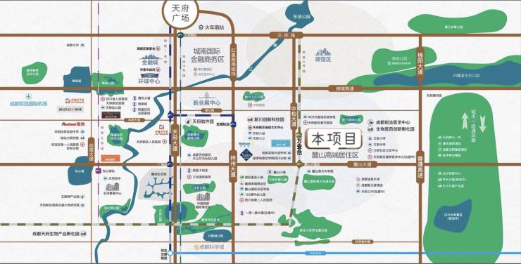 交通枢纽:坐拥天府前湾生态区,双机场辐射(双流机场/天府国际机场),3横3纵主干道+地铁6号线(麓山大道站)构建立体交通网,快速连接红星路南延线、天府大道、梓州大道等城市动脉