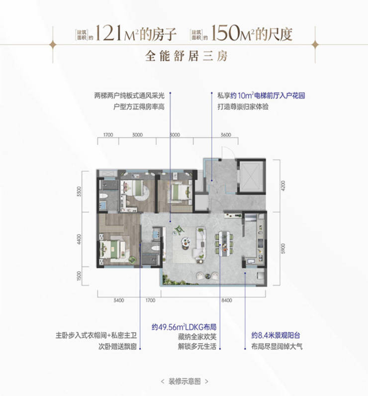 独立电梯厅设计,6.6米客厅开间搭配8.4米观景阳台,主卧套房配置独立衣帽间,全屋飘窗设计提升空间使用效率