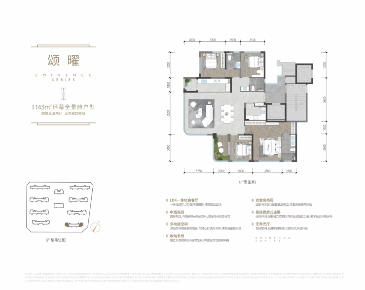 主打奢阔尺度,LDK厅面积超79㎡,13.8米的环幕采光面为家庭社交、娱乐提供剧场式空间。双主卧套房设计,配备独立衣帽间、豪华主卫,满足多代同堂的私密居住需求。