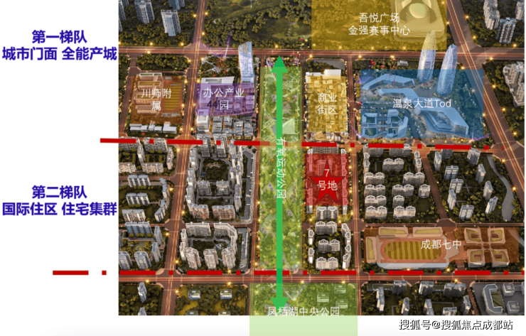 整个4300亩的科创城,最头部的版块就是中央景观生态中轴和城市黄金中轴构成的这个十字区域 而7号地位于景观生态中轴之上的核心中央位置,是整个4300亩科创城CBD第二梯队国际住区中,最紧邻核心资源的地块(离19号线地铁站最近、离商业最近、离公园最近、离七中学校最近),每次归家都穿越约1KM的生态景观中轴。