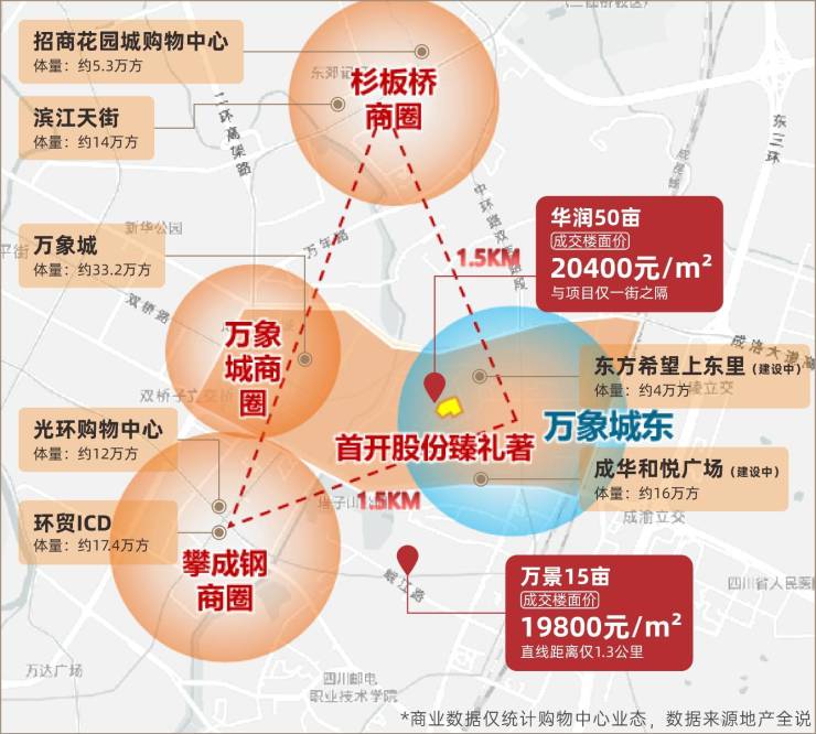 顶级商业:万象城/环贸ICD/滨江天街;在建综合体:成华和悦广场/东方希望上东里;社区商业:鲁能城秀街/润街等