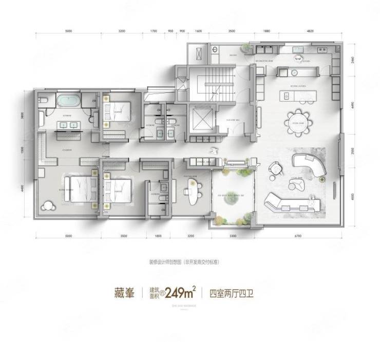 249㎡户型:一层一户配置,4室2厅4卫,南北通透。亮点包括270°环幕客厅、私人会所式空间及“三庭院”设计(空中岛院+星光花园+入户光院),适合高端社交与家庭互动。
