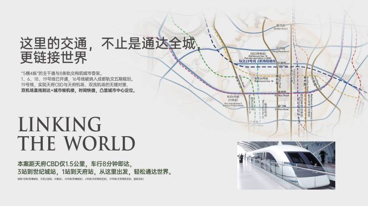 项目距天府CBD仅1.5公里,出家门即可上南北动脉梓州大道。近地铁1号线(西博城站、天府公园站、兴隆站);18号线(西博城站)、6号线(天府商务区站);19号线(天府商务区站、蓝家店站)实现天府CBD与天府机场、双流机场的无缝对接;仅需3站到世纪城,1站到天府站