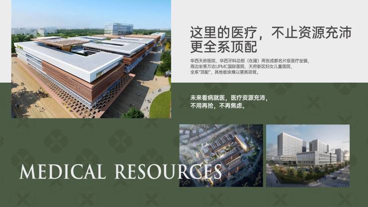 华西天府医院、华西牙科总部(在建),周边坐落万达UPMC国际医院、天府新区妇女儿童医院