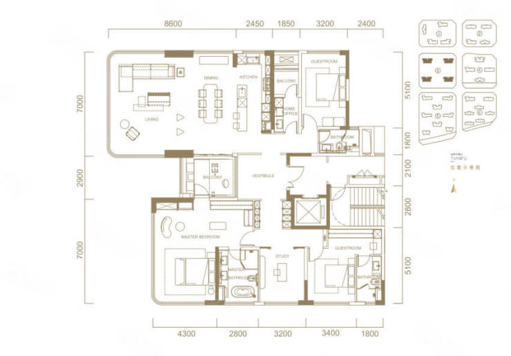 2. 大平层 173㎡(4 室 2 厅 3 卫)