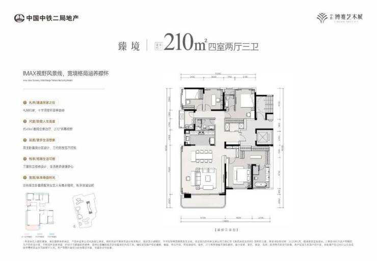 在成都一环核心区五年仅出让六宗土地的稀缺背景下,中铁二局地产打造的超400亩中铁艺术城已成为难以复制的标杆之作。作为这一大型综合体的重要组成部分,中铁博雅艺术城占地约24.5亩,规划为住宅兼容商业用地,容积率控制在3.0。项目整体规划三栋住宅与两栋商业建筑,其中1号、3号楼采用2梯3户布局,2号楼则配置2梯2户,主力户型涵盖约170-230㎡六种四房格局,精准定位追求生活品质的改善型客群。