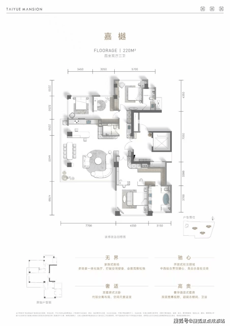 定制级产品:项目仅274席天际大平层,产品包括173-220㎡云端大平层,240-560㎡奢华跃层,写字楼级别的核心筒结构,具备极强的可变性。