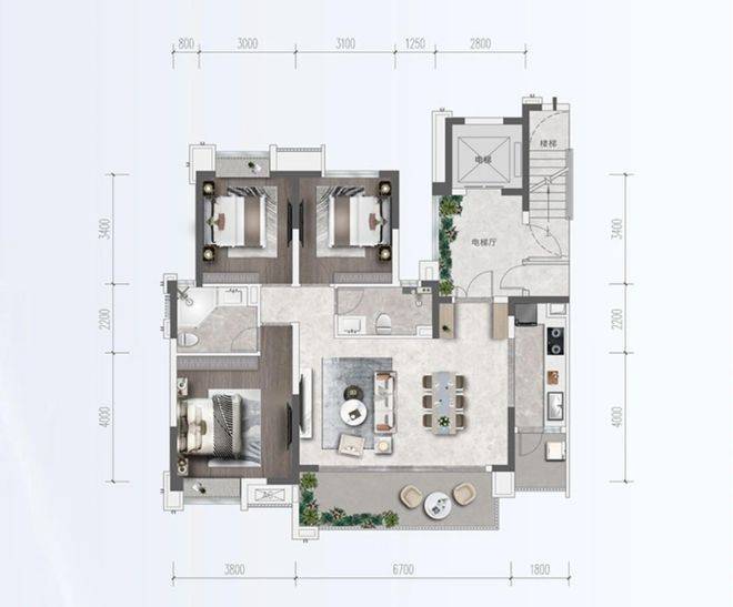 南北通透板式结构,6米横厅串联客餐厅,双阳台设计实现景观与功能分区。主卧套房配备独立卫浴,全屋卧室保持3米以上开间。