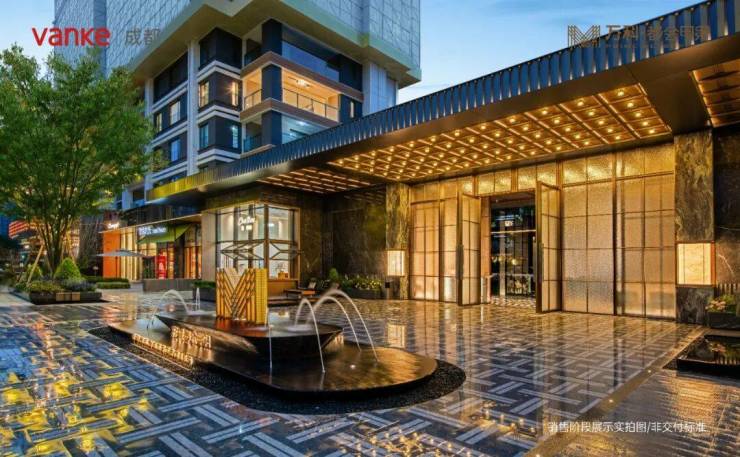 建筑设计汲取瑰丽酒店美学精髓,约38米酒店式门庭采用"见光不见灯"的照明设计;奢廊序厅灵感源自法国艾特勒塔花园,台阶与球形植被相映成趣;全落地玻璃打造的都会蝶苑,实现270°环景视野;各具特色的宅间花园,营造出林水交融的自然意境。