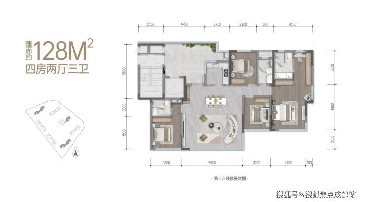 建面128㎡,实得约158㎡四房三卫双套房,约20㎡独立光厅入户,联动厨房生活空间,约50㎡方厅,超32㎡奢阔主卧套房搭配双套房设计。