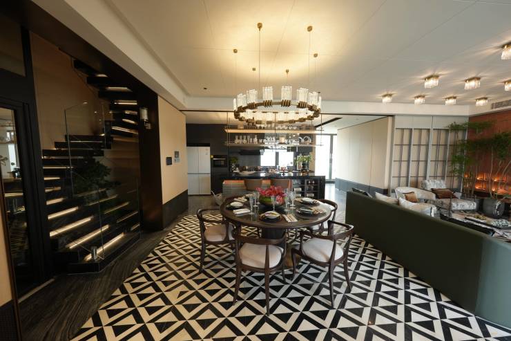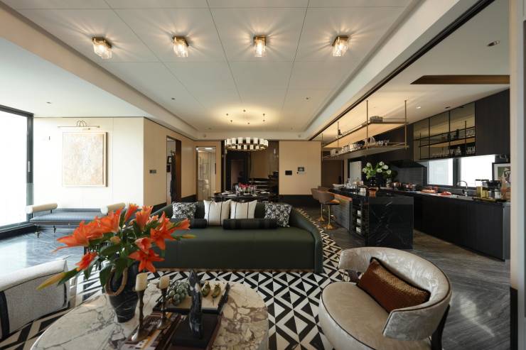 美学表达:室内空间搭配艺术品级软装,营造高雅格调。黑白拼花石材的餐厅地面,搭配带高脚椅的酒吧台,尽享餐前餐后的惬意时光,大胆运用色彩与高端材质,演绎出现代美学的极致魅力。