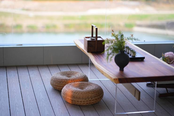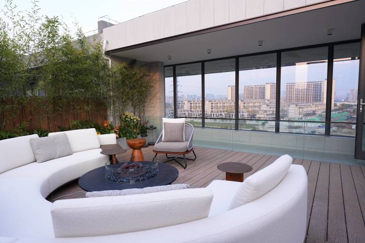 景观营造: 一线江安河湾景观资源,私家花园与屋顶露台,打造多重立体景观,将自然融入生活。露台配备了休闲沙发、酒吧台以及装饰性绿植,营造出一个集休闲、娱乐和社交于一体的户外空间,如同宝格丽酒店般,将自然与建筑完美融合,营造低调奢华的氛围。