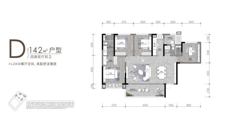 142㎡/179㎡四居室:阔绰空间尺度,179㎡户型特别增设独立家政间及多功能房,满足多代同住的品质需求。