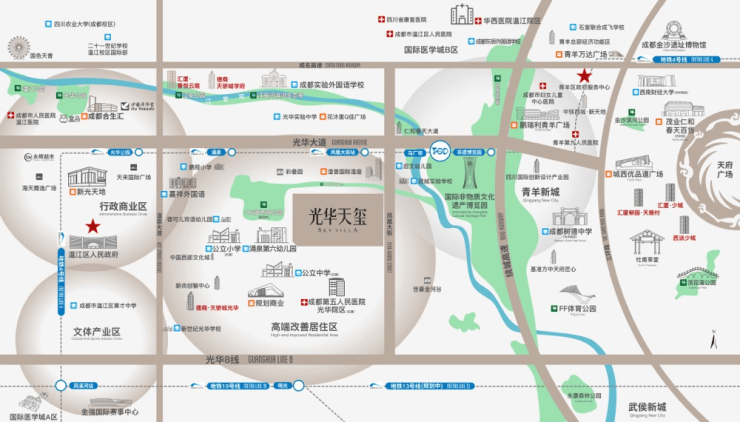 光华天玺位于光华新城南,土地价值第一梯队。温江向东,青羊向西,双区门户配套资源共享。